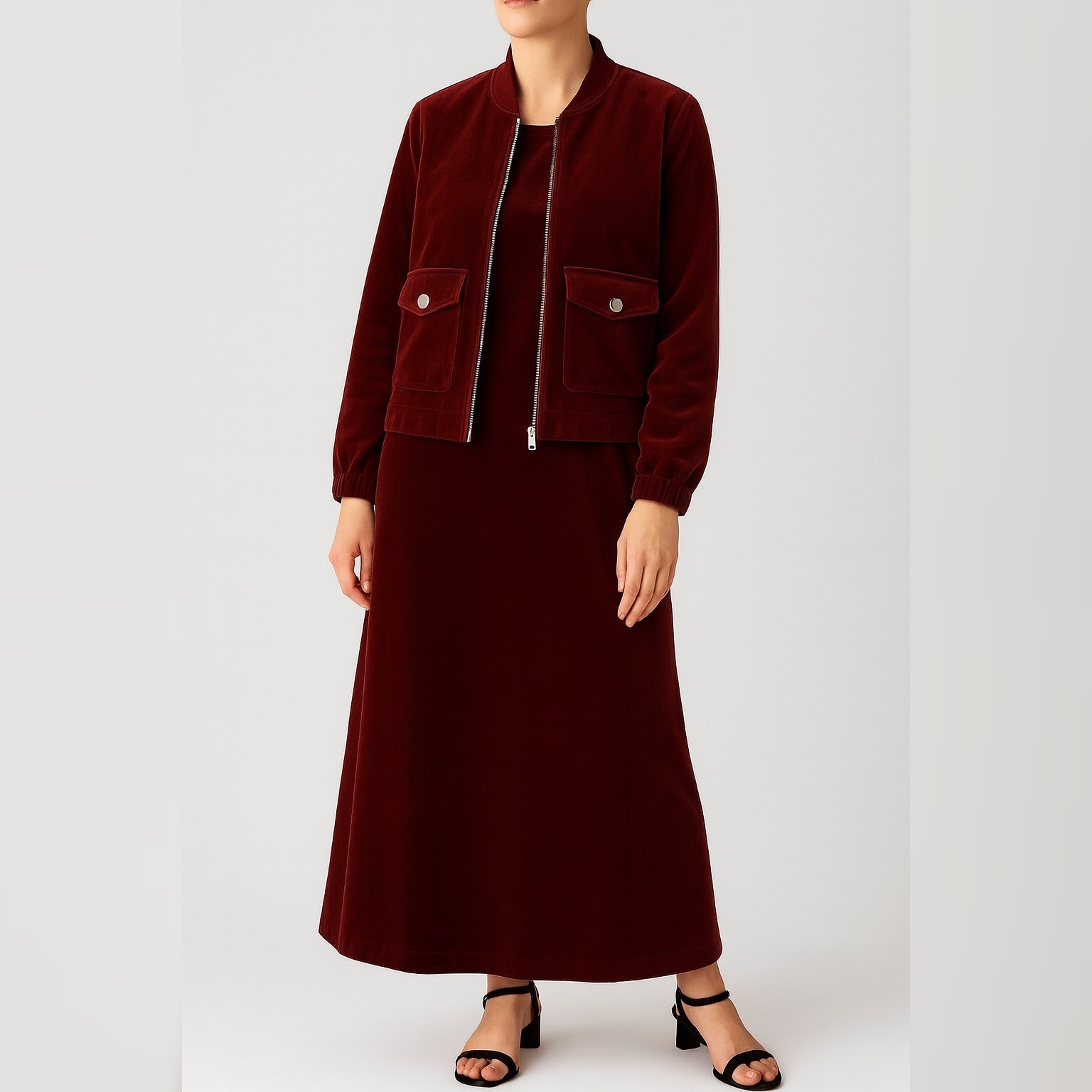 A full-length velvet dress paired with a matching velvet zip-up jacket. The inner dress is designed for elegance and comfort, while the front-zip jacket adds a stylish, structured layer. Perfect for formal events, festive occasions, or evening wear.