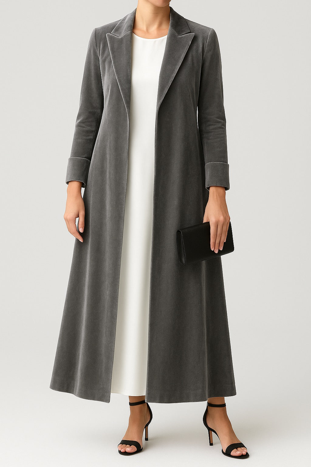 A luxurious velvet dress set featuring a flowing floor-length gown paired with inner slip dress. The gown, made from rich velvet, includes elegant details ,a front-open design, while the inner adds comfort and contrast. Ideal for formal events, weddings, or evening parties, this ensemble blends timeless elegance with modern sophistication.